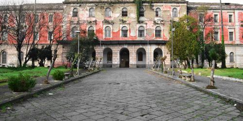Aversa, Ospedale Psichiatrico di “S. Maria Maddalena”. Il viale di accesso con la facciata principale del corpo centrale (foto Elena Manzo, 2014)