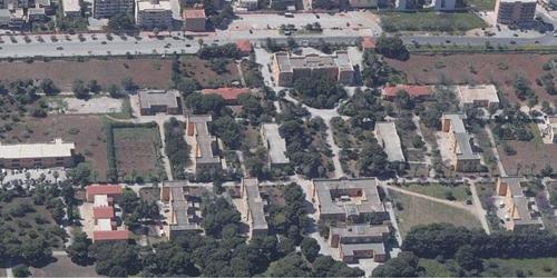 Veduta aerea dell’attuale “Cittadella della Salute” (ex Ospedale psichiatrico) dal Monte San Giuliano; si noti in alto l’asse del viale della Provincia