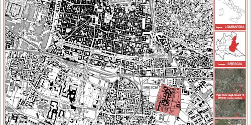 Localizzazione su Carta Tecnica Ragionale (CTR Lombardia, scala 1:10.000) dell'Ospedale Psichiatrico Provinciale di Brescia all'interno del contesto urbanizzato (elaborazione grafica di Sara Raggi)