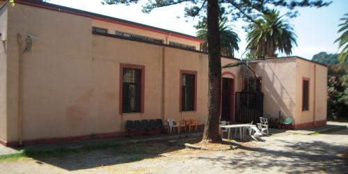 L’ingresso al manicomio è formato da una cancellata e da due piccoli edifici, sopra i quali sono le statue dei fiumi Chienti e Potenza; sullo sfondo, il fronte del fabbricato principale in una foto