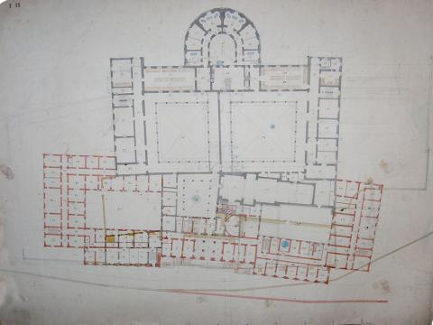 G. Pardini, disegno con la pianta del piano terreno relativo al secondo progetto di ampliamento del manicomio (Fondazione Marchi di Firenze, dis. n. 175)